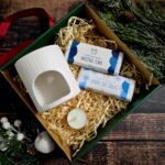 W eleganckim, ręcznie przygotowanym zestawie prezentowym kryją się trzy wyjątkowe mini woski sojowe, ułożone w ozdobnym pudełku z delikatnym wypełnieniem i przewiązane świąteczną tasiemką.
