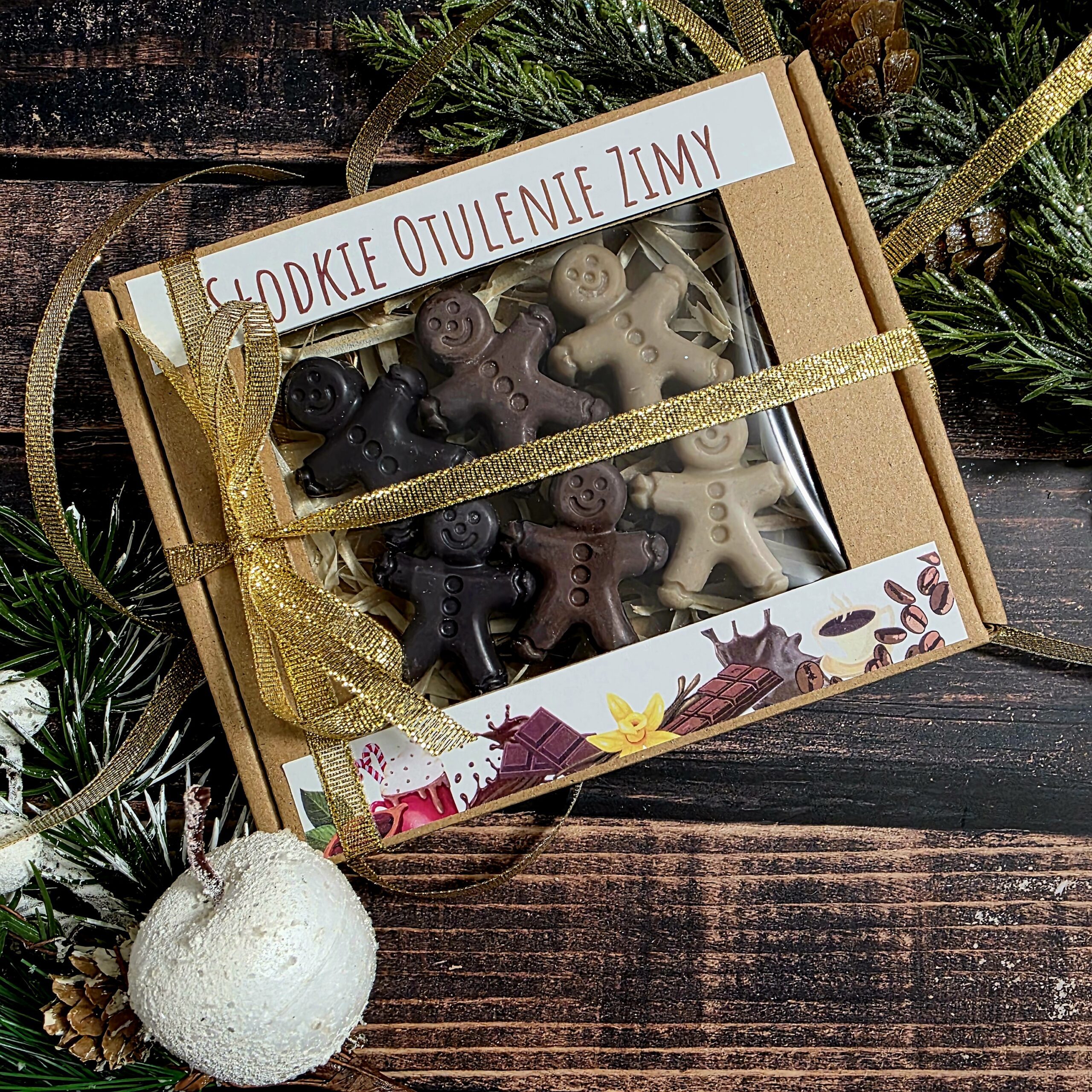 W eleganckim, ręcznie przygotowanym zestawie prezentowym kryją się trzy wyjątkowe mini woski sojowe, ułożone w ozdobnym pudełku z delikatnym wypełnieniem i przewiązane świąteczną tasiemką.