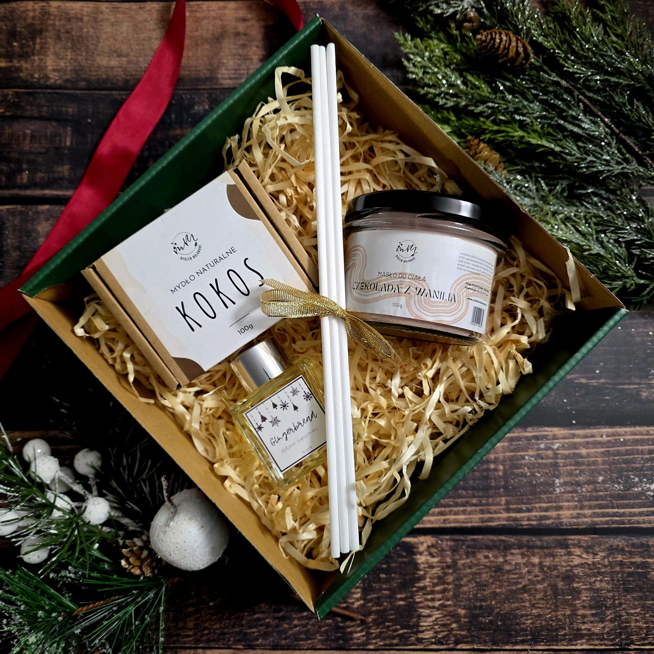 Podaruj odrobinę natury w słodkiej, świątecznej oprawie. Słodkie Święta to elegancki zestaw prezentowy, w którym znajdziesz naturalne, ręcznie tworzone mydło kokosowe, odżywcze masło do ciała o zapachu czekolady z wanilią oraz aromatyczny dyfuzor zapachowy Gingerbread, wypełniający wnętrze ciepłą, piernikową nutą. Całość zamknięta w ozdobnym pudełku z wypełnieniem i przewiązana świąteczną tasiemką – gotowa, by zachwycić obdarowaną osobę.